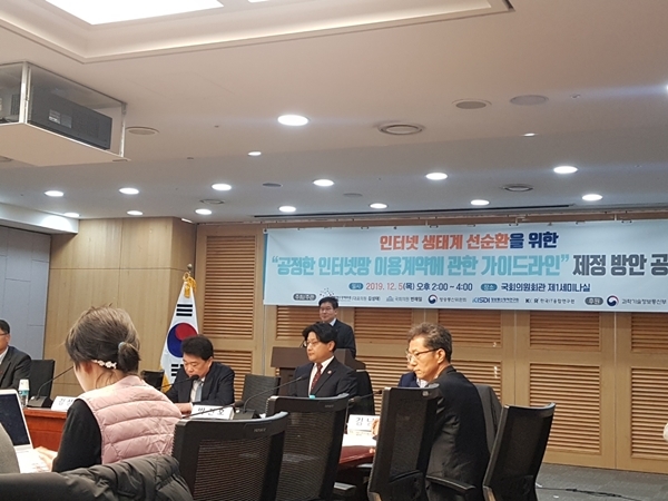 이미지 확대보기5일 서울 여의도 국회의원회관에서 열린 '인터넷생태계 선순환을 위한 공정한 인터넷망 이용계약에 대한 가이드라인' 공청회엔 CP 측 입장을 대변하는 한국인터넷기업협회 관계자와 ISP 입장을 대변하는 한국통신사업자연합회 관계자가 참석, 연내 가이드라인 제정 추진을 앞둔 '인터넷망 이용계약 가이드라인' 제정 기준에 대한 팽팽한 의견 대립 양상을 보였다.