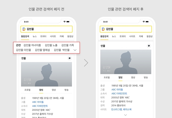 이는 지난 10월 시행된 연예뉴스 댓글 잠정 폐지에 이은 뉴스·검색 서비스 개편 계획의 일환으로, 개인의 인격과 명예, 사생활을 보호하기 위한 결정이라고 카카오는 밝혔다. 현재 카카오가 제공 중인 '관련 검색어'와 '서제스트(검색어 자동 완성 추천)' 기능은 이용자들의 검색 빅데이터를 바탕으로 다양한 정보를 제공하고, 검색 편의성을 높여주기 위한 서비스다. 그러나 카카오는 이 기능이 인물과 결합되면서 개인의 인격과 사생활 침해, 명예 훼손 등 부작용이 발생하고 있다고 판단했다.