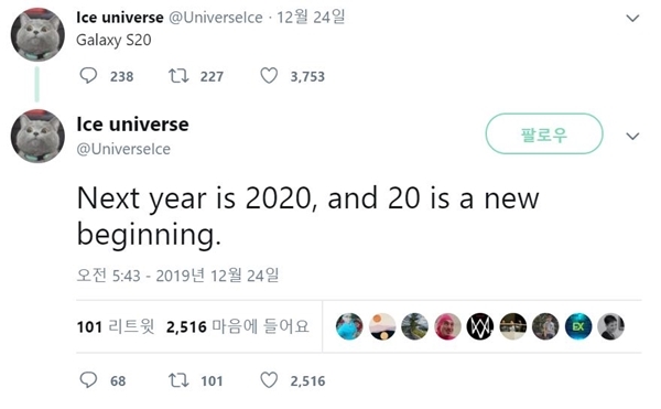 스마트기기 제품 정보 발표전 유출로 유명한 트위터리안 빙우주(@Ice Universe)는 지난 24일(현지시각) 트위터에 "새해는 2020, 20은 새로운 시작.(Next year is 2020, and 20 is a new beginning.)"이라는 트윗 문구를 올렸다. 새해 초 나올 삼성전자의 신작 갤럭시S 시리즈가 갤럭시S20이라는 이름으로 나올 것이란 뜻이다.