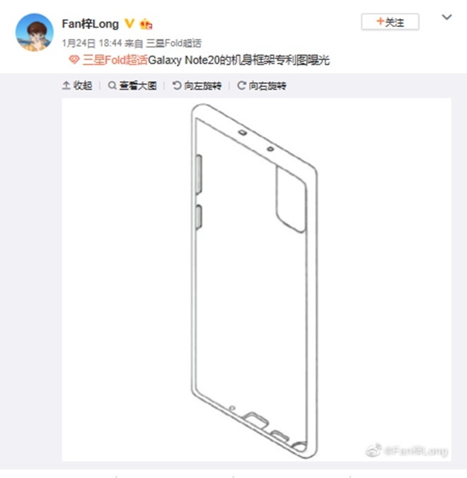 이 웨이보에는 ‘来自 三星Fold超话 Galaxy Note20的机身框架专利图曝光’이라고 쓰여 있다. 즉, ‘삼성 갤럭시노트20 동체프레임 특허도면 노출’이라는 의미다. 그리고 이 내용이 ‘超话(초화)’, 즉 ‘슈퍼 토론’, 즉 끝장토론방에서 나온 것이라고 밝히고 있다.