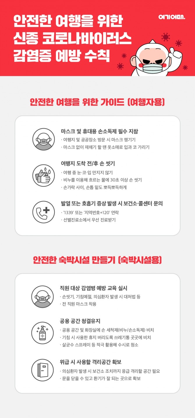 여기어때는 여해자에게 마스크와 손소독제를 지참해 여행지, 공공장소를 방문할 때를 대비할 것을 당부했다. 여기에 여행지 도착 전후로 세정제를 사용해 흐르는 물에 30초 이상 손을 씻는 일도 강조했다.