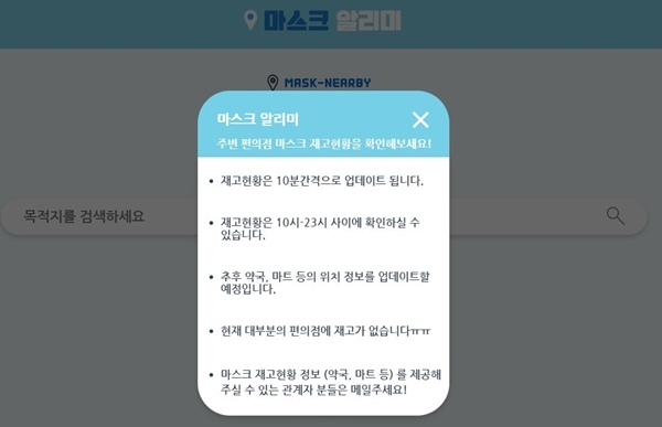 마스크 알리미는 이용자 주변에 있는 편의점의 마스크 재고를 알려준다. 재고는 10분 간격으로 업데이트된다. 개발팀은 향후엔 약국이나 마트의 위치정보도 추가할 계획이다.