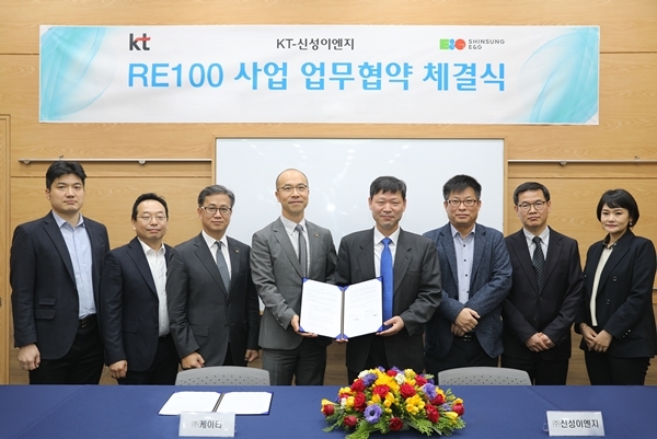이미지 확대보기KT는 경기도 분당 신성이엔지 사옥에서 재생에너지 사용인정제도와 RE100 유관사업 공동개발을 위한 협력 양해각서(MOU)를 체결했다고 29일 밝혔다.