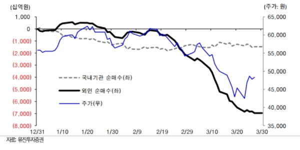 앞서 증권사들은 삼성전자 1분기 실적발표가 다가올수록 영업이익을 내렸다. 한화투자증권은 올해 1분기 삼성전자의 영업이익을 5조8000억 원으로, KB증권도 5조8000억 원으로 6조 원 아래로 추정했다.