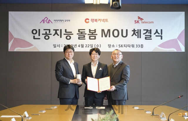 SK텔레콤과 (재)행복커넥트는 내달 아리아케어코리아 이용고객 가운데 200가구를 대상으로 ‘AI 돌봄’ 서비스를 시작한다. 24시간 어르신들의 상태를 체크할 수 있는 통합 관리용 애플리케이션(앱)도 제공한다.