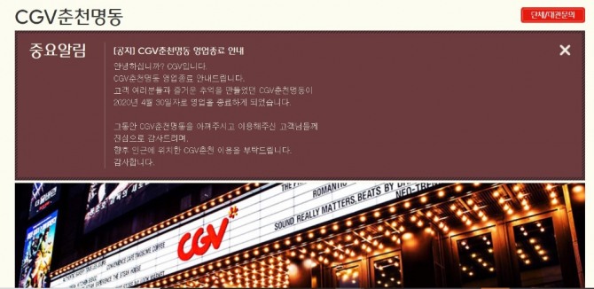 본사와 위탁 점주가 맺은 5년 단위의 계약이 지난 4월 30일 종료되면서 춘천 명동점의 권리는 롯데시네마에 넘겨졌다. CGV는 위탁 점주의 의사를 존중해 계약 재연장을 하지 않기로 했다.