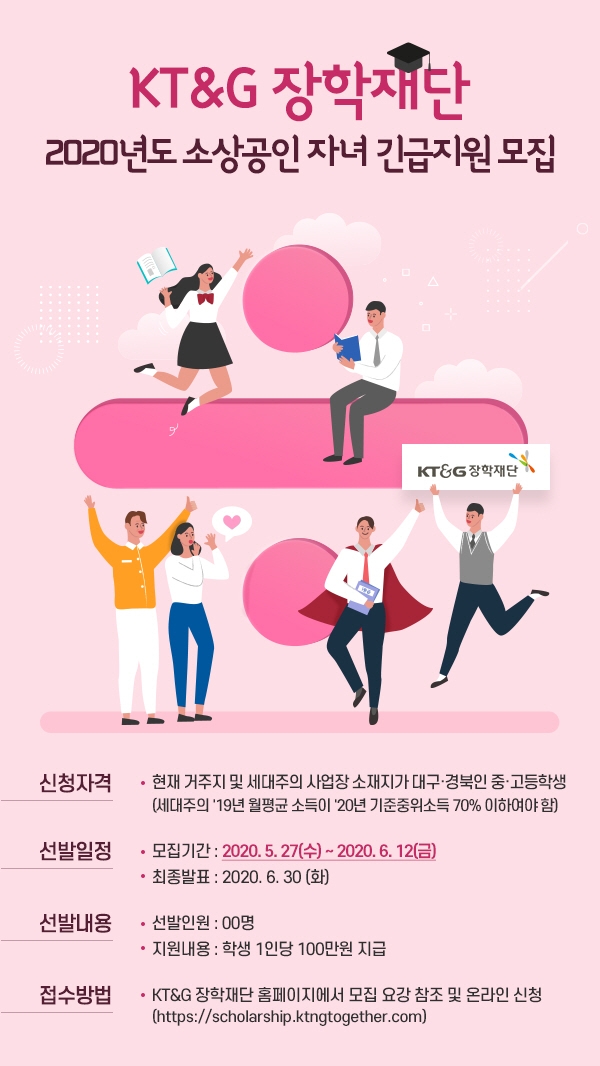 장학생 모집 인원은 100명 규모며 1인당 100만 원이 지급된다. 2020년 기준중위소득 70% 이하인 대구·경북지역 영세 소상공인 중·고교생 자녀라면 누구나 KT&G장학재단 홈페이지에서 장학생 신청을 할 수 있다. 신청은 KT&G장학재단 홈페이지에서 오는 27일부터 6월 12일까지 진행된다. 서류 접수 후 공정한 심사를 거쳐 최종 수혜자가 선정되며 결과는 6월 30일 발표된다.