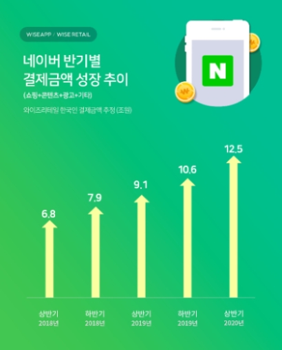 이미지 확대보기앱·리테일 분석서비스를 제공하는 와이즈리테일의 21일 자료에 따르면, 올해 상반기 네이버에서만 12조 5000억 원의 금액이 결제된 것으로 조사됐다.