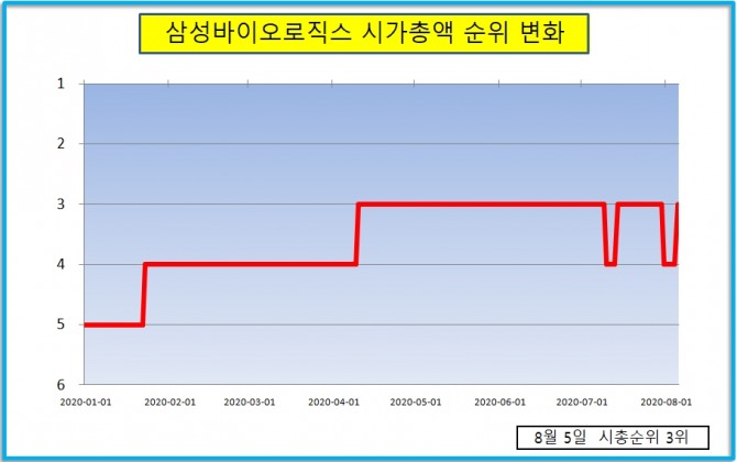 삼성바이오로직스는 지난해 시가총액 순위 5위에서 꾸준히 상승했다.