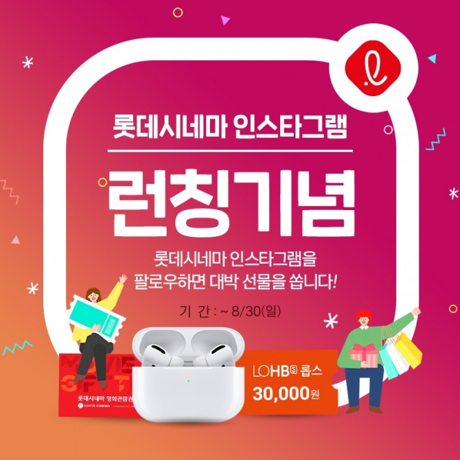 롯데시네마는 이달 4일 영화와 굿즈 정보, 행사 정보를 전달하고 관객과 소통을 강화하기 위해 페이스북‧유튜브에 이어 공식 인스타그램 채널을 선보였다. 계정을 ‘팔로우’한 후 캡처한 화면을 이벤트 페이지에 게재한 관객 대상으로 에어팟 프로, 롭스 3만 원 상품권, 영화관람권을 경품으로 제공하는 행사가 오는 30일까지 진행된다.
