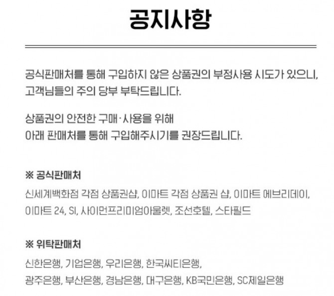 회사 관계자는 "안전한 상품권 구매를 위해 백화점, 이마트 등 공식 상품권 판매처를 이용해 주시길 당부한다"면서 "명절을 앞두고 상품권 수요가 증가하는 기간 온라인 등을 통한 상품권 사기에 대한 각별한 주의가 필요하다"고 말했다.