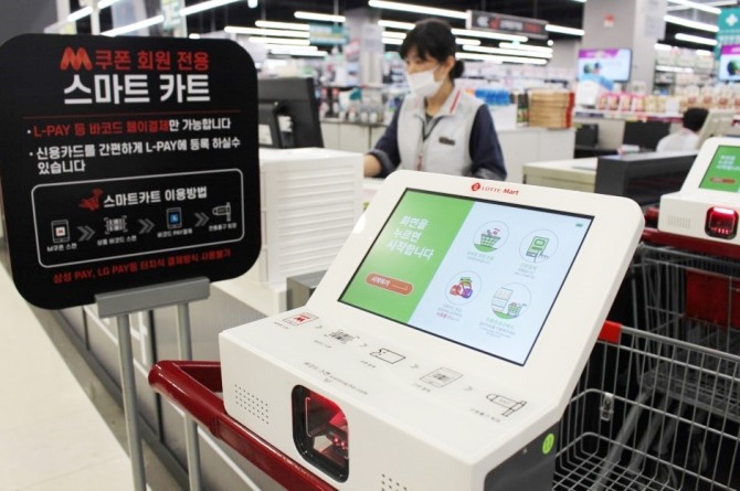 올해 4월 중계점과 광교점에 비치된 스마트 카트는 카트 안에 설치된 리더기가 작동해 계산대에 가지 않고도 카트에서 바로 결제를 할 수 있는 기기다. 롯데마트 지난 5개월간 MZ세대 고객들의 스마트 카트 이용률이 매월 약 30%씩 증가(전월 대비)했다고 설명했다.
