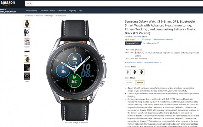 8일(현지시간) 엔가젯 등 외신에 따르면 정가 430달러(약 51만원)인 갤럭시 워치3는 15%의 할인율을 적용해 현재 365.30달러(약 43만원)에 판매되고 있다.