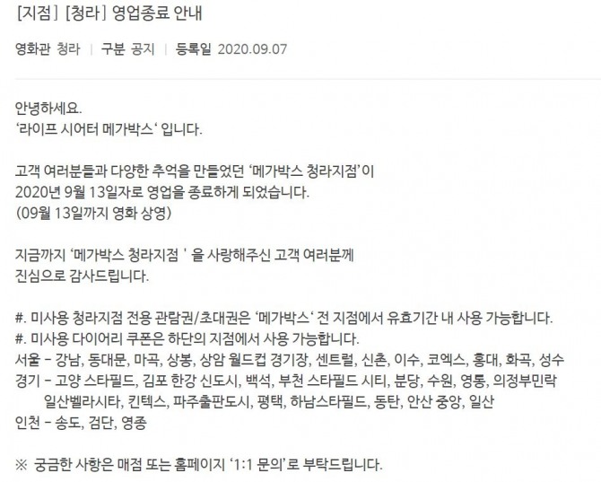 메가박스도 각각 이달 14일, 15일부터 인천 청라점과 경남 사천점의 영화 상영을 중단했다. 이 회사는 사전에 공식 홈페이지에 두 지점 영업 종료 소식을 공지했다.