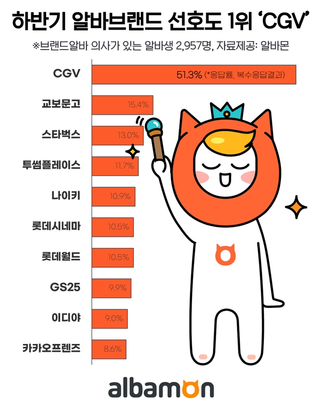 이들이 꼽은 알바브랜드 1위는 CGV로 51.3%를 차지했다.