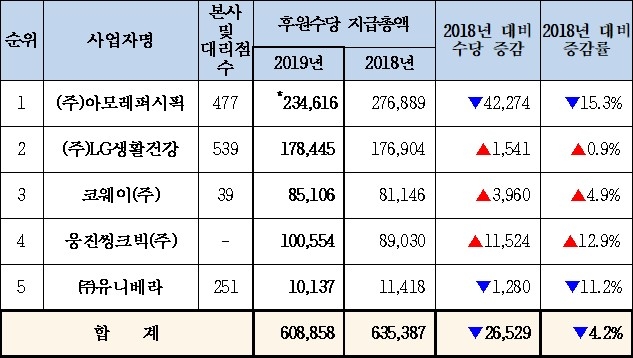 후원수당 수령자의 1인당 연평균 수령액은 전년보다 10.2% 감소한 359만 원이었다.