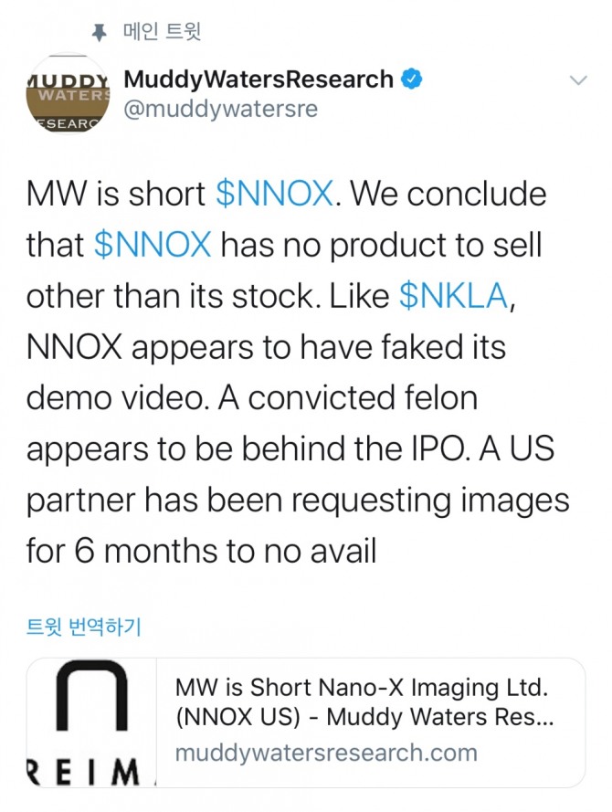 미국의 공매도 투자 세력인 머디워터스리서치는 22일(현지 시간) 나녹스에 사기 의혹을 제기한 짧은 보고서를 트위터를 통해 공개하면서 나녹스의 사기 의혹을 제기했다.