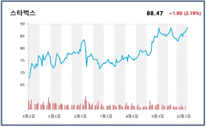 이미지 확대보기CNBC는 6일 월가의 애널리스트들이 스타벅스 주식의 목표가를 85달러에서 101달러로 상향 조정한 이후 지난 5일 끝난 증시에서 2% 넘게 상승 마감했다도 보도했다.