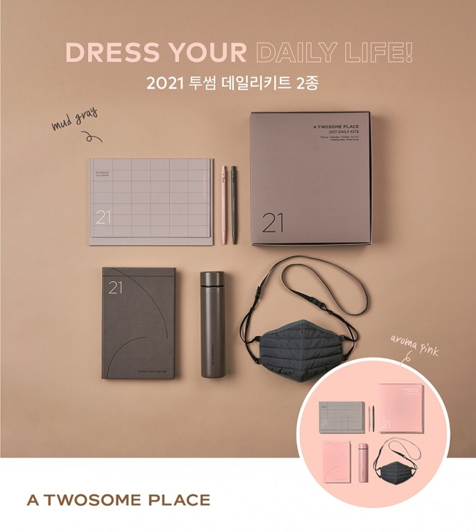이에 앞서 투썸플레이스는 지난 28일부터 전국 매장에서 ‘2021 데일리키트’ 한정 판매에 돌입했다. 데일리키트는 ‘아로마핑크’와 ‘머드그레이’ 두 색상으로 출시됐으며 ▲플래너 ▲아메리카노(R) 3잔 쿠폰 ▲미니 텀블러 ▲스탠드형 캘린더(달력) ▲모나미 볼펜 2개 ▲패션 방한 마스크 ▲마스크 스트랩 등으로 구성됐다.