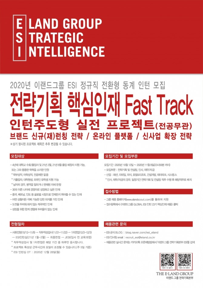 이랜드그룹 관계자는 “단순히 영어를 잘하고, 자격증이 많은 보편적인 고스펙 인재가 아닌 끊임없는 도전과 성장하고자 하는 열정을 가진 인재를 선호한다”면서 “ESI만의 인재 성장 커리큘럼을 계기로 남들과는 다르게 제대로 배우고 성장해 자신의 역량을 발휘하고자 하는 분들의 지원을 기다린다”고 말했다.