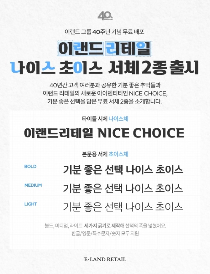이미지 확대보기이랜드리테일은 타이틀 전용 서체 ‘나이스체’와 본문 전용 서체 ‘초이스체’ 등 2종(이하 NC 나이스초이스체)의 전용 서체를 오는 4일부터 회사 공식 홈페이지에서 무료 배포한다.
