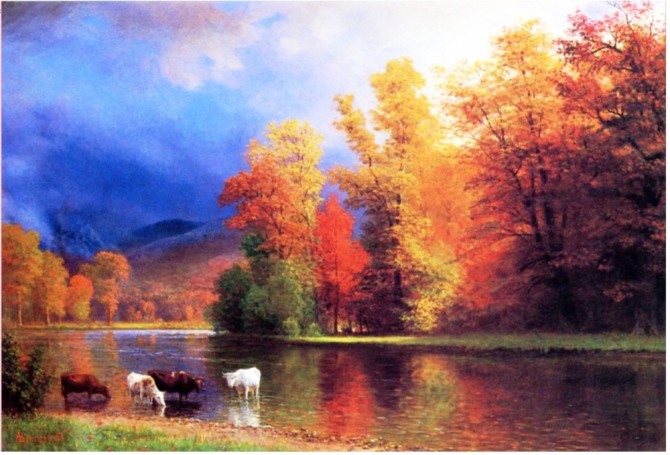 알베르트 비어슈타트(Albert Bierstadt, 1830~1902)의 그림 ‘하구에서’를 처음 보았을 때, 나는 가장 먼저 황동규 시인의 ‘북한강가에서’가 생각이 났다. 그림 속에는 점박이 개 한 마리도 보이지 않는데도 불구하고 말이다. 말하자면 강물을 마시는 검정빛과 하얀색 소 뒤로 펼쳐지는 늦가을의 노랗고 빨간 나뭇잎과 드높은 하늘색과 흰 구름이 그저 바라보기만 해도 마음에 평안이 찾아들었다.