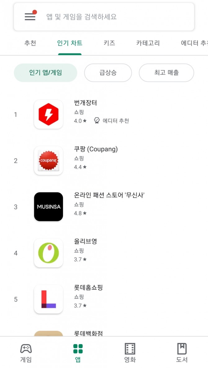 이미지 확대보기10일 모바일 앱 분석 사이트 ‘앱애니’에서 제공한 순위에 따르면 번개장터는 구글 플레이스토어쇼핑 부문 인기 차트에서 한 달 연속(2020년 10월 10일~2020년 11월 9일) 1위를 기록하고 있다. 같은 순위에서 ‘쿠팡’은 2위를 차지했으며 ‘무신사’와 ‘올리브영’이 각각 3, 4위로 뒤를 이었다.