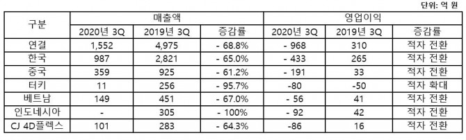 이번 분기 CGV가 진출한 모든 국가를 비롯해 자회사인 CJ 4D플렉스도 영업 적자를 기록했다. 다만 국내 코로나19 상황이 최고조에 이른 지난 2분기의 영업손실(1305억 원)과 비교할 때 3분기에는 손실 폭을 줄였다. 최악의 국면은 지났다는 평가다.