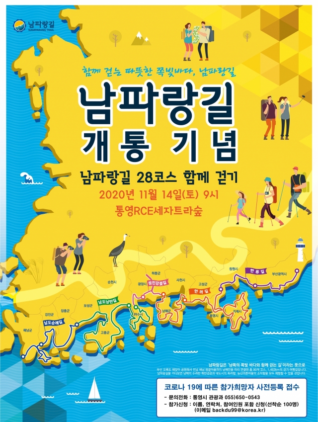 이미지 확대보기경남 통영시는 오는 14일 용남면 통영RCE세자트라숲에서 코리아둘레길 남해안 노선인 ‘남파랑길 개통’을 알리는 걷기 행사를 개최한다고 11일 밝혔다.