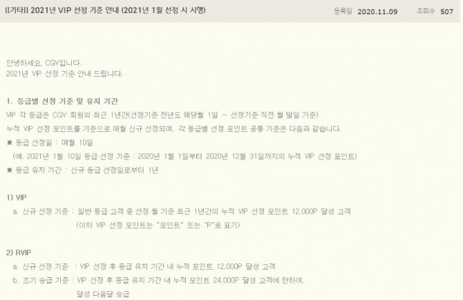 이미지 확대보기먼저 CJ CGV(이하 CGV)는 오는 2021년 1월부터 새롭게 적용되는 VIP 선정 기준을 발표했다.