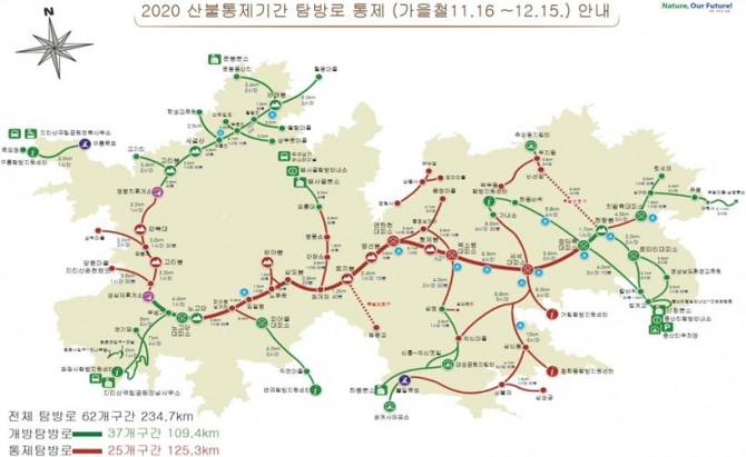 이미지 확대보기이번 산불방지 대책기간 중 출입통제 탐방로는 종주 능선상의 '노고단~장터목' 구간을 비롯 '거림~세석~가내소', '치밭목~천왕봉', '불일폭포~삼신봉' 등 25개 구간 125.3km이다.