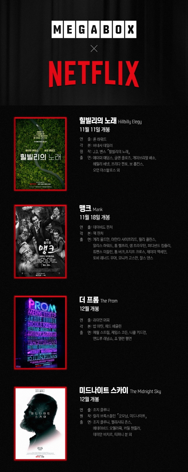 메가박스 관계자는 “질 좋은 넷플릭스의 작품을 큰 스크린과 완벽한 음향 설비를 갖춘 극장에서 먼저 만나볼 수 있다는 것에 많은 영화 팬들의 기대가 모이고 있다. 앞으로도 고객 인식과 시장의 변화에 발맞춰 새로운 극장 경험을 제공할 수 있도록 노력하겠다”고 말했다.