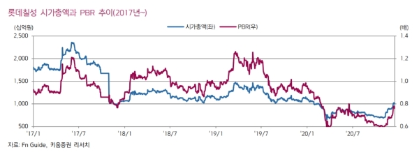 롯데칠성 주가는 지난 6월 장중 11만8000원까지 올랐다. 그 뒤 차익매물이 나오며 지난달 2일 8만5600원까지 하락했다. 이를 저점으로 이달부터 본격오르며 52주 최고가에 가까이 다가서는 모습이다.