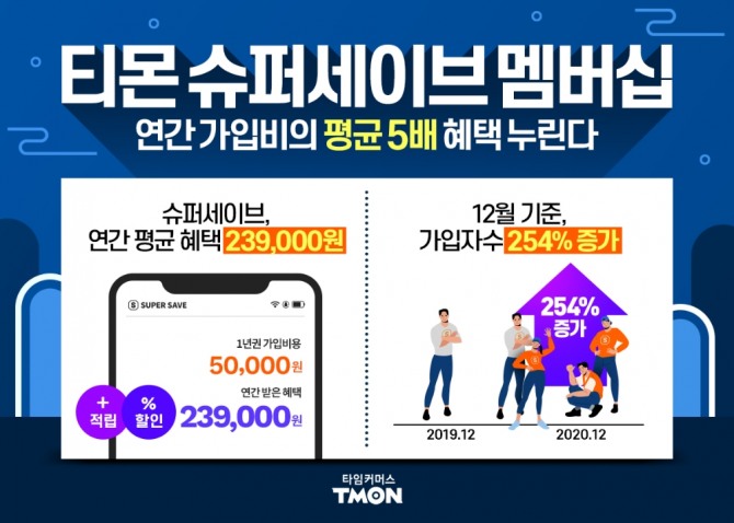 슈퍼세이브는 쇼핑에 따른 적립과 할인, 회원만의 전용 특가딜 등으로 쇼핑에 최적화된 멤버십으로 꼽힌다. 회원 전용 특가딜과 이벤트, 차별화된 할인쿠폰과 적립혜택 등의 혜택을 제공한다. 이에 지난 12월 말 기준 티몬 슈퍼세이브 가입자 수는 직전년 같은 기간 대비 254% 증가했다.