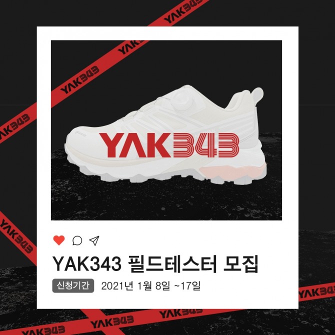 이미지 확대보기등산화 야크343은 산행 시 효과적인 에너지 사용에 도움을 줄 블랙야크만의 독창적인 기술이 적용됐다. 필드 테스터는 이 등산화를 지원받게 되며, 야크343을 직접 신고 테스트한 산행 경험을 사진과 영상으로 제작해 개인 소셜미디어(SNS) 계정에 올리는 언택트 미션을 개별적으로 수행하게 된다.