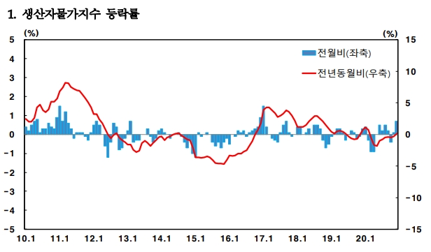 한은 관계자는 “2020년 12월 생산자물가지수는 국제유가 상승 등의 영향으로 공산품을 중심으로 상승했다”고 설명했다.