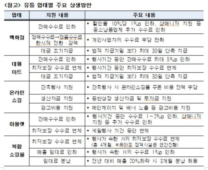 올 말까지 납품대금 조기 지급, 판촉행사 시 쿠폰비‧광고비 지원 등