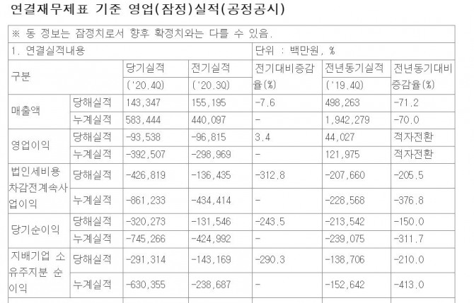 국내외 코로나19로 불확실성 지속되며 영업손익 적자 전환