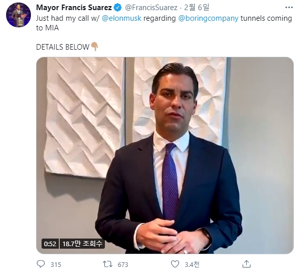 9일(이하 현지시간) 산업 전문매체 인터레스팅엔지니어링에 따르면 프랜시스 수아레즈 마이애미 시장은 지난 5일 보링컴퍼니의 일론 머스크 최고경영자(CEO)와 전화 통화를 한 사실을 트위터에 올린 글을 통해 공개했다.