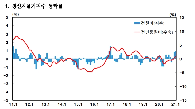 이미지 확대보기한국은행은 1월 생산자물가지가 104.88로 전월대비 0.9% 상승했다고 19일 밝혔다. 이는 2017년 1월 상승률 1.5% 이후 가장 큰 상승폭이다.