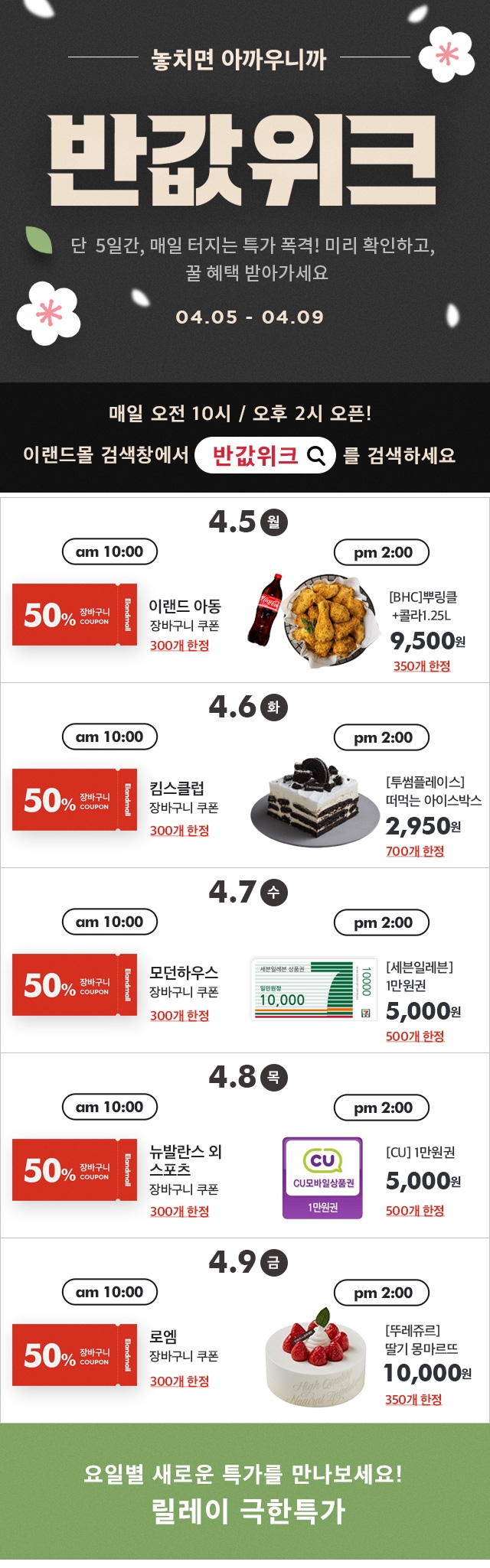 매일 진행되는 릴레이 반값행사에서는 오전 10시 인기 브랜드 반값쿠폰을, 오후 2시에는 선착순 반값상품을 선보인다. 주요 상품은 ▲5일 오전 10시 이랜드 아동 브랜드 반값쿠폰 ▲5일 오후 2시 bhc 뿌링클+콜라 ▲6일 오전 10시 킴스클럽 반값쿠폰 ▲6일 오후 2시 투썸플레이스 떠먹는 아이스박스 등이다.