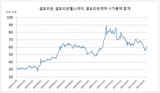 셀트리온 3개 계열사의 시가총액은 지난달 28일 60조 원 아래로 내려온 후 7거래일 만에 다시 60조 원대 를 회복했다.