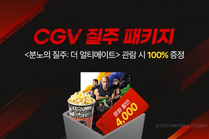 질주 패키지는 고소팝콘(중) 무료 쿠폰 1매와 2D 영화 4000원 할인 쿠폰 1매로 구성된 상품이다. CGV는 오는 25일까지 분노의 질주를 관람하고 CJ ONE 포인트를 적립한 고객 모두에게 질주 패키지 일괄 지급한다. 해당 패키지는 6월 한 달간 사용할 수 있다.