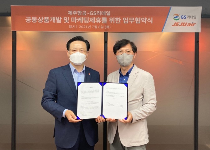 이미지 확대보기GS리테일은 8일 제주항공과 신상품 개발과 공동 마케팅을 위한 업무협약(MOU)을 체결했다. 이날 업무협약에는 오진석 GS리테일 편의점사업부장(부사장)과 김이배 제주항공 대표이사 등 양사의 주요 실무자들이 참석했다.
