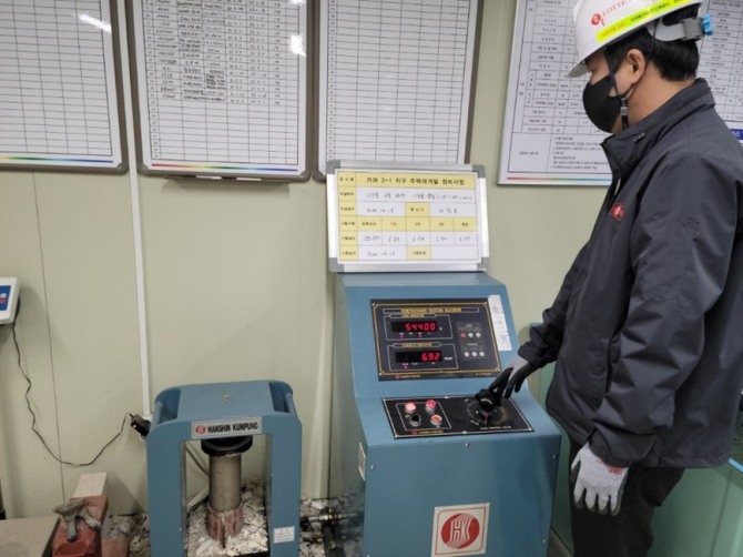 롯데건설 기술연구원 박순전 원장은 “실제 거여 및 철산동 현장에 이번에 개발한 화학 혼화제를 적용해 20시간 5MPa 확보하고, 간절기 및 동절기 층당 공기 지연을 최소화했으며, 이산화탄소 발생량 저감 효과까지 확인했다” 면서 “콘크리트 구조체 품질 확보를 위해 해당 기술 적용을 지속적으로 확대해 나갈 것”이라고 말했다.