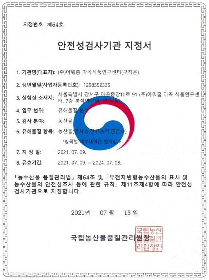 이미지 확대보기아워홈은 ‘농수산물 품질관리법’ 제64조, ‘유전자변형농수산물의 표시와 농수산물의 안전성조사 등에 관한 규칙’ 제11조 제4항에 따라 국립농산물품질관리원으로부터 안전성 검사기관 제64호로 지정받았다. 유효기간은 오는 2024년 7월까지다.
