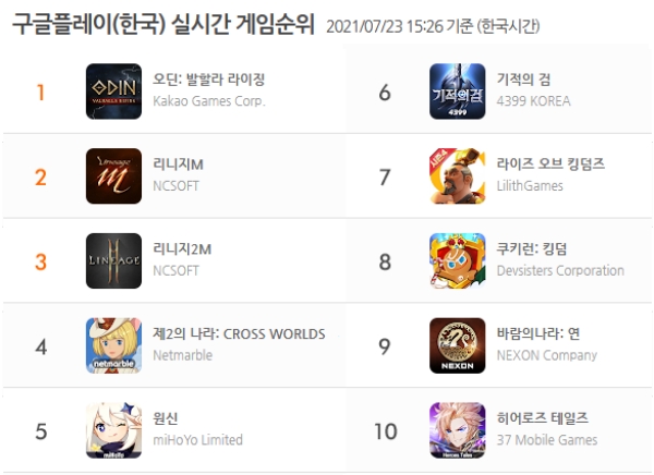 이미지 확대보기카카오게임즈 '오딘: 발할라 라이징', NC '리니지M'이 각각 1, 2위 자리를 굳힌 가운데 '리니지2M'과 넷마블 '제2의 나라: Crosss Worlds'는 2주 동안 3위를 두고 혈투를 벌이고 있다.