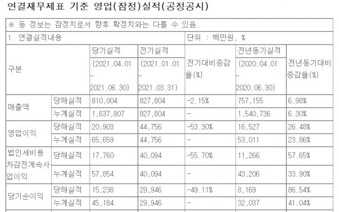 매출은 지난해 2분기 대비 6.98% 늘어 8100억 400만 원을. 당기순이익은 86.54% 상승한 152억 3800만 원을 기록했다.