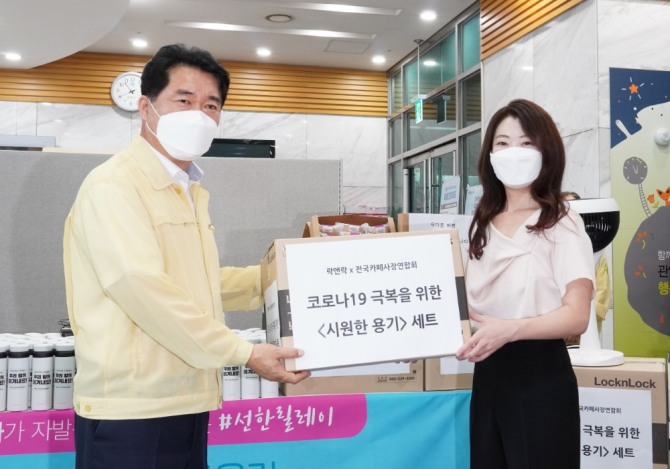 락앤락은 전국카페사장연합회와 손잡고 무더위에 지친 코로나19 선별진료소 의료진과 자원봉사자들을 위해 ‘시원한 용기 세트(음료+텀블러)’ 500개를 마련, 말복인 10일 오전 서울 관악구 보건소 선별진료소를 찾아 전달식을 가졌다.