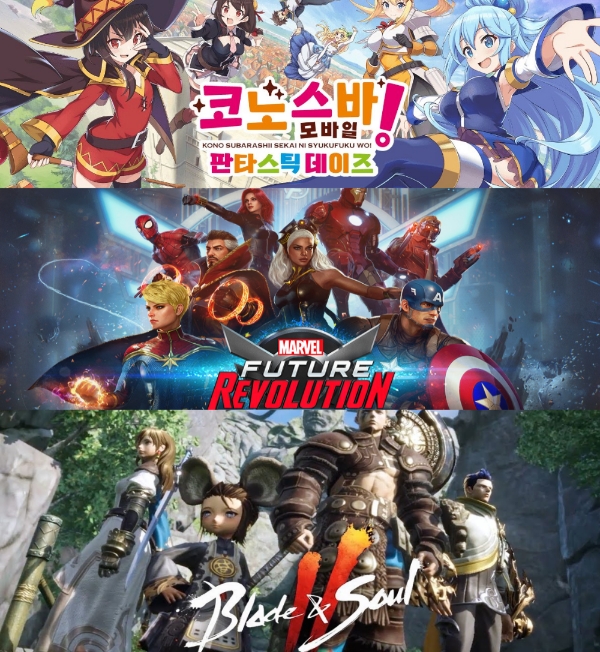 이미지 확대보기지난달 19일부터 26일까지 넥슨 '이 멋진 세계에 축복을! 판타스틱 데이즈(이하 코노스바 모바일)', 넷마블 '마블 퓨처 레볼루션', NC '블레이드 앤 소울 2'를 내놓았다.